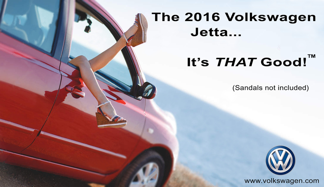 When I came upon this great image of a casual moment showing a woman with legs and sandals positioned freely outside a car window by the ocean, I had the idea to roll it into an ad campaign for Volkswagen. From what I recalled, they were known for their "hip" and thought provoking advertising. I think the image and my original tagline "It's That Good™" speaks for itself and conveys a sense of fun and carefree enjoyment that one could really only ever experience with the purchase of a new Volkswagen vehicle. I'm not even sure if the vehicle shown in this picture is a Volkswagen, but the image would be reshot and the font of the ad copy finessed to match brand requirements.**